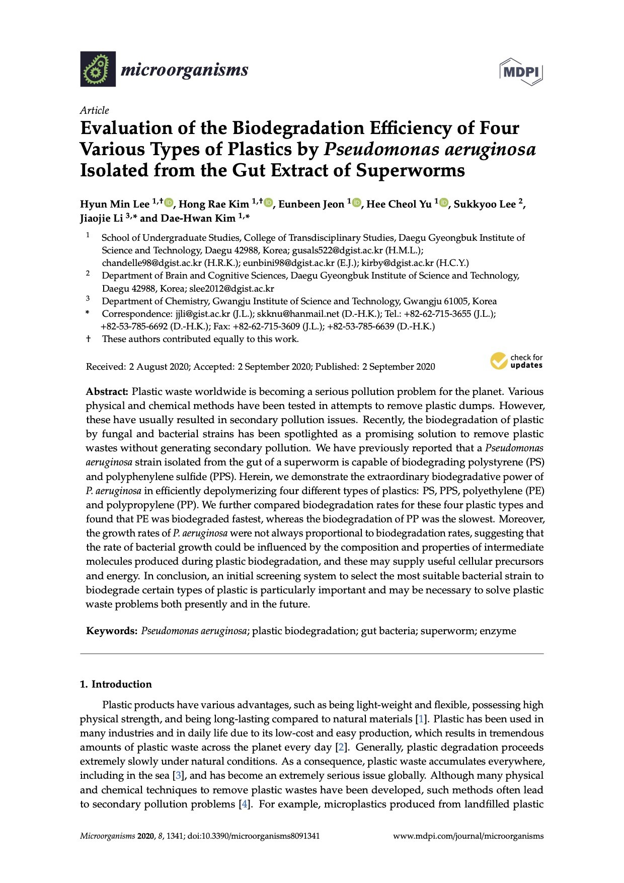Evaluation of the Biodegradation Efficiency of Four Various Types of Plastics by Pseudomonas aeruginosa Isolated from the Gut Extract of Superworms